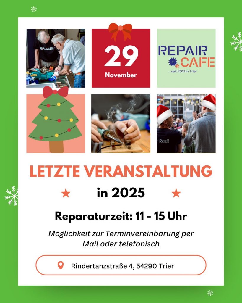 Am 29. November lädt das Repair Café Trier zum letzten Termin in diesem Jahr ein. Zwischen 11 und 15 Uhr besteht noch einmal die Gelegenheit, defekte Lieblingsstücke – vielleicht auch die Lichterkette für den Weihnachtsbaum – gemeinsam mit ehrenamtlichen Reparateuren zu reparieren. 🎄